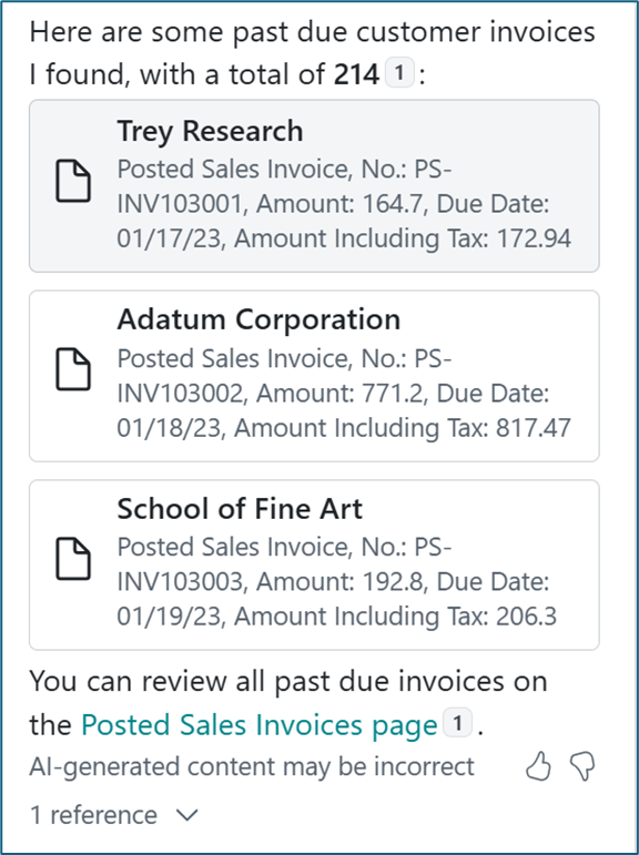 However, in February 2026, I typed the save question and got “I couldn’t find any customers invoices that are past due.” I try several iterations with same response. I ask Copilot to ‘look at customer ledger entries for remaining amount <> zero’ and got a list. On the Posted Sales Invoice page, I asked ‘ which invoices have remaining amount’ and got a list similar to the example above.