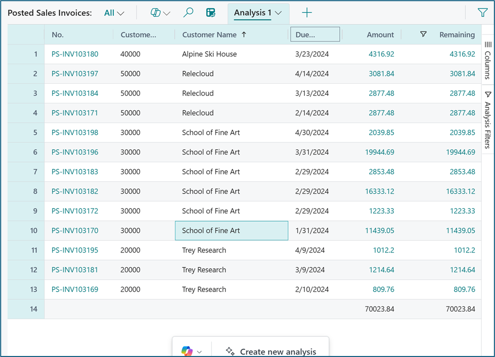 Results looked good, but I wanted to dig deeper and validate the results so I clicked on ‘1 reference’. WOW, a list of all posted sales invoices in Analysis Mode were displayed. This made me a little nervous because though I knew that the invoice had the due date, that’s not normally where I would expect to look for unpaid invoices. And then I saw that posted sales invoices have a field ‘remaining amount’ which is exactly what I would expect from the customer ledger. I did not want to see all the paid invoices so I added a filter for not equal to zero and done!