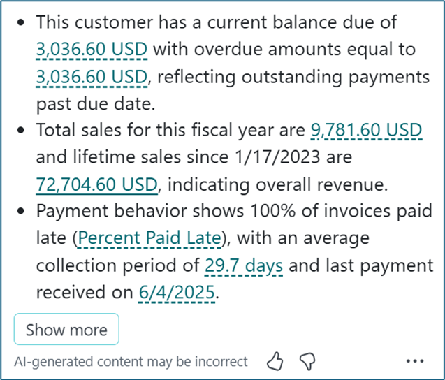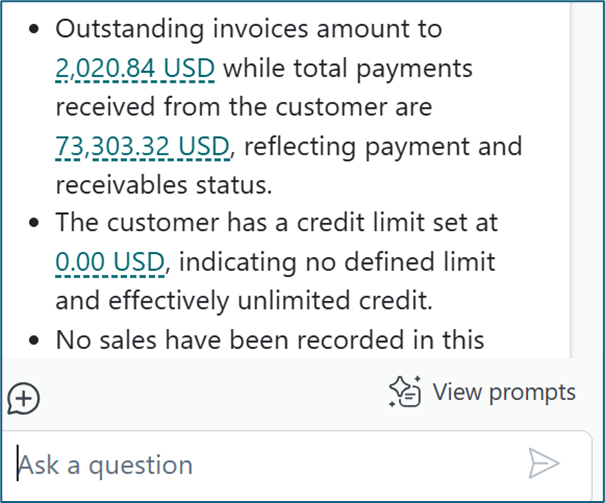 You may have noticed a feature when you open a customer or vendor record in the Fact Box pane. If you have hidden your Fact Boxes, open the pane. There is an option called Summary and just to the left of the work is the Copilot symbol.